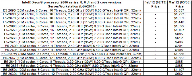 Yesterday, Intel announced the long-awaited server processor generation Sandy Bridge-EP, Xeon E5-26xx . The processors are manufactured on 32 nm technology, support four-channel memory, with up to eight physical cores with support for Hyper-Threading, equipped with a cache in the third level of up to 20 MB. The rate of information exchange via QPI up to 8 gigahertz per second. The TDP level not more than 130-150 watts, it uses the design concept LGA 2011.
