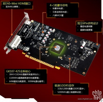 In general, the characteristics of the GeForce GT 740 is not surprising. Graphics processor GK107-425 ensures that 384 cores CUDA, 32 texture units and 16 ROP units, 128-bit bus. GDDR5 memory Volume can reach 1 GB or 2 GB, TDP level not more than 64 watts, and the recommended power supply - 300 Watt.