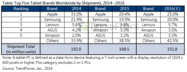 Analysts TrendForce in 2015 recorded a drop in shipments of tablet PCs, what they reported in their new report. According to the results of the last year it received a total of 168.5 million tablets, which is 12.2% less than in 2014. The trend of gradual reduction of global tablet shipments has become more pronounced.
