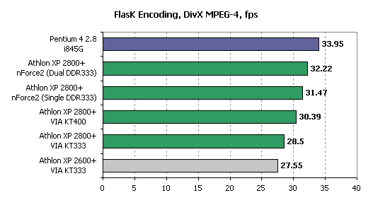 During video encoding Pentium 4 2.8GHz retained the leadership only due to the DivX\' high-quality optimization for SSE2 instructions not supported by seventh generation Athlon XP processors.