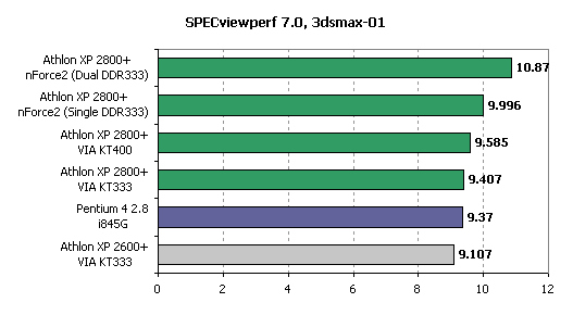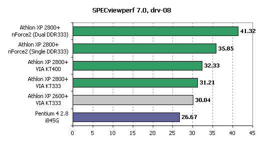 Professional SPECviewperf test package is an excellent benchmark for different memory subsystems. Therefore, no wonder that nForce2 appeared almost phenomenally fast sometimes. In general, the advantage of Athlon XP 2800+ over Pentium 4 2.8GHz can be explained by the fact that professional OpenGL applications included into this package are very much dependent on the computational capacity of the CPU without involving any SSE2 instructions.