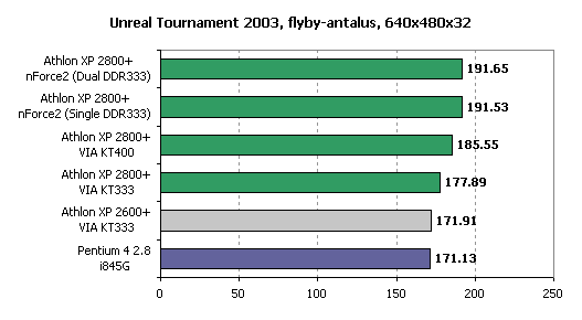 In the new Unreal Tournament 2003 game the advantage is again with AMD Athlon XP 2800+.