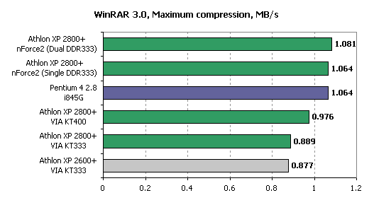 The competing Pentium 4 2.8GHz was also tested in a system with DDR333 memory. The system was based on i845G chipset, which is the today\'s fastest DDR solution for Intel processors. Note that although i845G doesn\'t officially support DDR333 SDRAM, the mainboards based on it can beautifully work with this memory type. In fact the upcoming i845GE due next week is none other but the same i845G with the officially declared DDR333 SDRAM support.