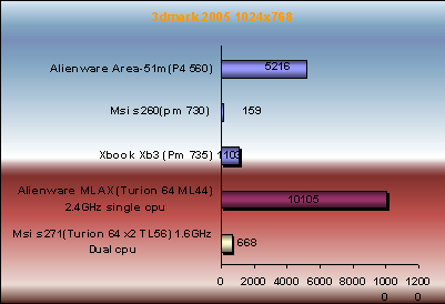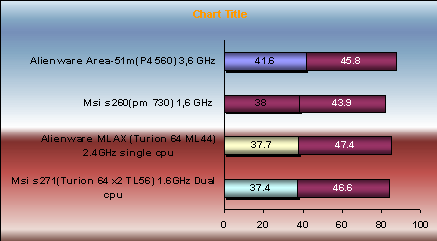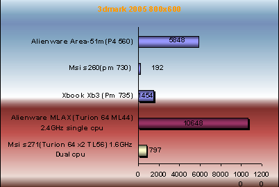 Alienware mALX could not be compared to any of the tested noetbook.It completely crushes the competition and even the Area-51m could not catch outdistanced (by 82 %). the MSI S271 does not fight in this benchmark category.However, its integrated graphic solution, is based on ATI Radeon X300.this last result with more than four times superior than the msi s260.