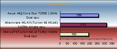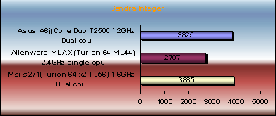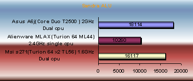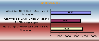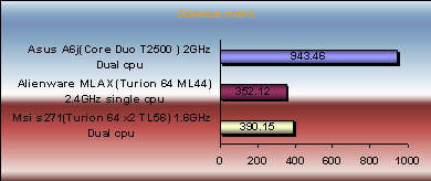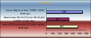 subsystem .Although the frequencies of operation distort a little the comparison (2,4 GHz for Turion 64 against 1,6 GHz for Turion 64 X2), we put them face to face with Asus notebook equipped with Core Duo T2500 (2 GHz).