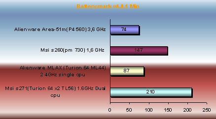 Before commenting the results of chart obtained with BatteryMark,once again we specify that this software simulates a "nice" use of the machine. However, the results of the Turion processors are interesting in more than one way.It should be noted first that the integration of SLI GeForce Go 7900 and the screen 19 inches, Alienware mALX increases the result of Area-51m with almost 15 minutes.the machine has a low battery life