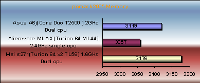 PCMark 05 proposes to measure the performances of the hdd and graphic card, but we was especially interested for the test of the processor and memory, like Sandra 2005 .Turion are in Net loose, taking into account the 800 MHz which separates it from the Turion 64, the X2 model left there more honourably, with 5 % higher performances than its little brother.Side memory , we does not find the results obtained under Sandra 2005.the