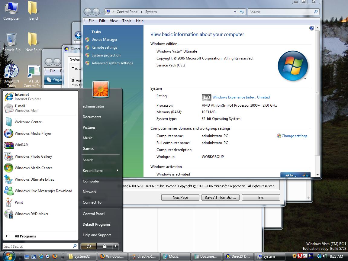 On our test system the installation was completed in 25 minutes. as in windows xp it is necessary to create a user account user. note :first windows vista start. we installed vista in system coupled with radeon x1600 pro 256mb but the system result in balck screen right after the install a kind of system stand by.as a solution fro such problem: u should restart in sade mode with command prompt support and then type in the console:devmgmt.msc and press enter:-). u should desable the first and the second display adaptator then restart your pc and windows vista will work normaly.u could then download driver from ati site and install them...