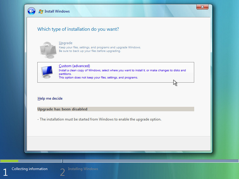 at the moment, the version Beta 2 of Windows Vista is a DVD disk and occupies nearly 3,2 Gig of hard disk space. The installation process was entirely re-examined, compared with Windows XP, and the usual succession of blue windows with indications text is not here any more. The stages of the installation process were reduced to the minimum. we starts thus by choosing the language of installation, the keyboard type and the country to determine regional specificities (date format, local currency, etc). Then the user is invited to enter the product key before accepting the licence. According to the system configuration , you will be able to choose between an installation in update of your Windows XP or a custum installation, the dual boot being automatically proposed if a windows XP version is detected. By selecting the custum installation you will have to select the hard disk and partition where windows vista will store its file.
