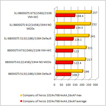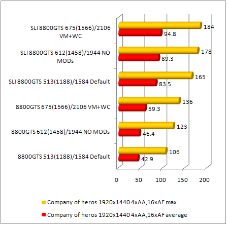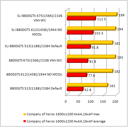 With such setting the game is very demanding both on video card and to memory volume . single 8800 GTS here, as in many other games, is sufficient to the resolution 1600x1200 , in the of 1600x1200 it is desirable to overclock the video card . Effect from regime SLI exists, but in the case of Company Of heroes one 8800 GTX with 748 Mb video memory will be more preferable than SLI of two 8800 GTS, because in the resolution higher than 1600x1200 the use of video memory already exceeds 620 Mb. The speed of processor limits the minimum quantity of frames per second at the level of 55 fps. In this case the first core is loaded almost completely, and the second only half. Optimization under dual processors in this game leaves much to be desired.