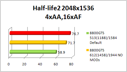 Even if we include mapping the balance of the load graphic processors, then the corresponding strip at the screen did not appear after the starting of game. In order to look load, was necessary in the control pannel driver to change option regime performance SLI from the value recommanded NVIDIA on custum. After this, it was obvious that driver actually work in regime SLI and the load of graphic processors is distributed equally, but repeated testing with this option showed that there is no increase from SLI . But in the case of Half-Life regime SLI is not necessary, testing one 8800 GTS showed that it is completely sufficient for the game at any resolutions. Processor limits the quantity of frame per second at the level higher than 100 this is sufficient.