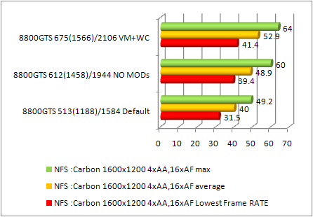 In those regimes, the result is limited to processor, the minimum quantity of frames per second is located on the level of 50-60 fps and this it is completely sufficient for normal gaming. The performance of single video card is sufficient in 1024x768 and 1280x1024, and if its overclocked then 1600x1200. It is insufficient for higher regimes to use one 8800 GTS, but with two 8800 GTS in SLI it is possible to play in all regimes up to 2048x1536.