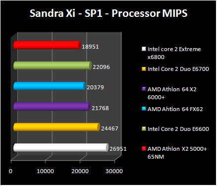 The processor test Sandra gives its favors to Core 2 X6800 Extreme. However, in term of operations in floating point, Athlon 64 X2 6000+ finishes second but considering the million instructions per second, it is only fourth, behind Core 2 Duo E6600. Compared with Athlon 64 FX 62, Athlon 64 X2 6000+ is 7% faster .