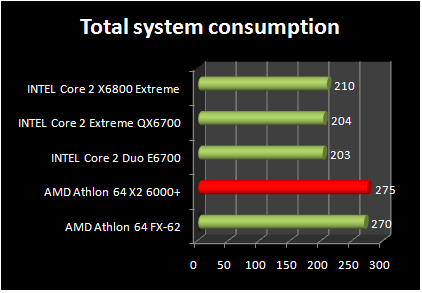 The Athlon 64 X2 6000+ remains in 90Nm, and that it has only the new core revision , this can result in high power consumption and heat from such processor. In practice, our fears was confirmed since our Athlon 64 X2 6000+ has 63° C in full load! . Power consumption, was also a huge since our system containing X2 6000+ use largely more than 270 Watts against… 200 Watts for Core 2 Duo E6600. We take on consideration the total system power consumption and we note aaso that it is known that the chipsets nForce 590 consume more watt than INTEL i975X .