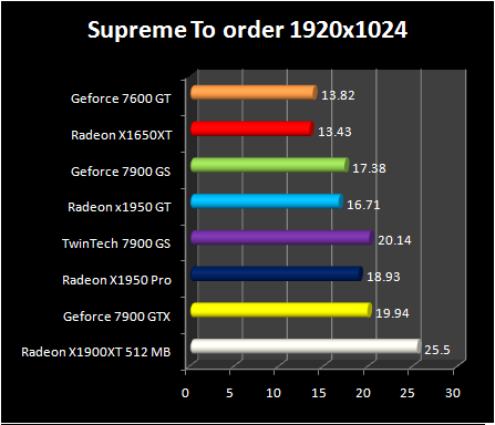 Under F.E.A.R., tested here in its last version, the performances of Radeon X1950 GT are about the same as GeForce 7900 GS. The overclocked model from Twintech succeeds in rising the performance of 7900gs to the level of Radeon X1950 Pro whereas GeForce 7900 GTX and Radeon X1900 XT 512 MB occupy, with equality, the highest place . The comparison of performances between Radeon X1950 GT and Radeon X1650 XT reveals here a profit in 44% in 1920x1200 .