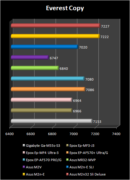 The rate of data copying in Everest memory test is clearly worse in motherboards on chipset SIS, Via and ATI.