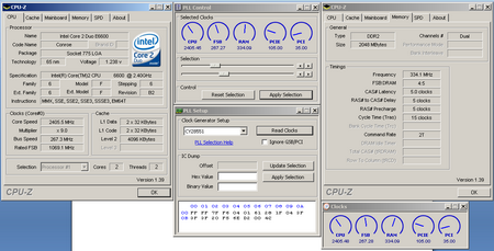 Thus, usually the processor overclock is reduced to a simple increase in the FSB frequency . If the processor intel core 2 Duo e6300 is able to increase the system bus frequency (FSB) from 266 to 400 MHz, then the processor frequency will rise by almost 1000 MHz, to 2.8 GHz, if we increase the FSB to 500, then it will be reach 3.5 GHz and so on as I in case of our previous example with the E6600 the fsb was set at default value in the first scrennshot we have the processor working at default rating 2400 MHZ (266x9 ), then we increased the FSB to 280 and we got 2530 MHz , after we bumped the FSB to 333mhz and we got 3000 MHz and so on ..... In principle, these information can be controlled by the bios (BASIC INPUT-OUTPUT SYSTEM) of your motherboard. But there are some special features, which must be considered with overclock . You will learn the majorities of nuances in the course of time, some are unknown even to me, since new nuances appear with new processors models , but some special features can be considered as previous one.