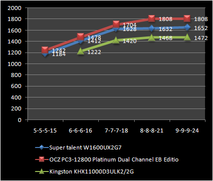 The latency test of the modules Kingston KHX11000D3ULK2/2G show the worst results ( than products on base of micron chips ) , they actually work with 1375 MHz frequency using the latency 5-57-5-15 regime, inaccessible neither for OCZ PC 3-12800 Platinum dual channel EB edition north for Super talent W1600UX2G7.