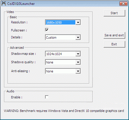 Call of juarez bench (Direct 3d 10) – minimum quality setting , shadow switched off;