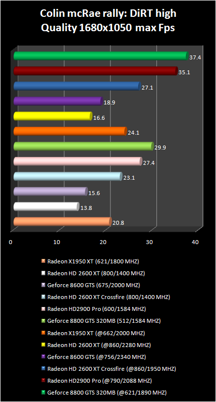 The Radeon HD 2900 Pro proved to be just faster than the more expensive GeForce 8800 GTS. the pair radeon HD 2600 XT is slower than Radeon HD 2900 Pro. Frame -rate in colin mcRae rally: DiRT game using the maximum quality setting are very low with video cards as Radeon HD 2900 Pro and GeForce 8800 GTS . Therefore there is no neeed for better quality test .