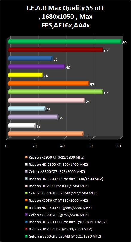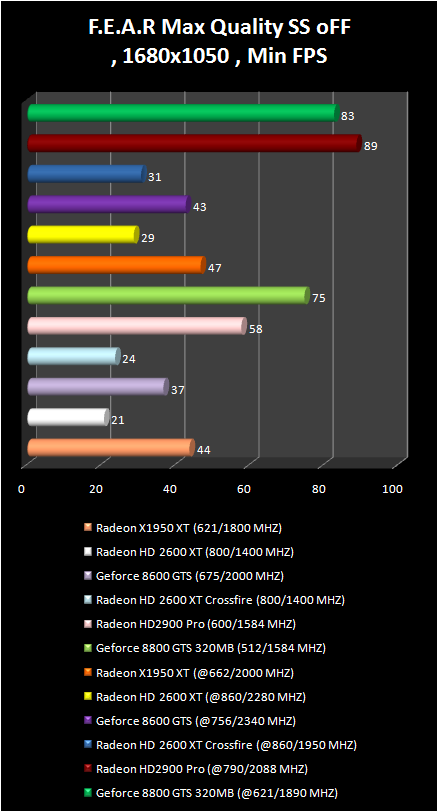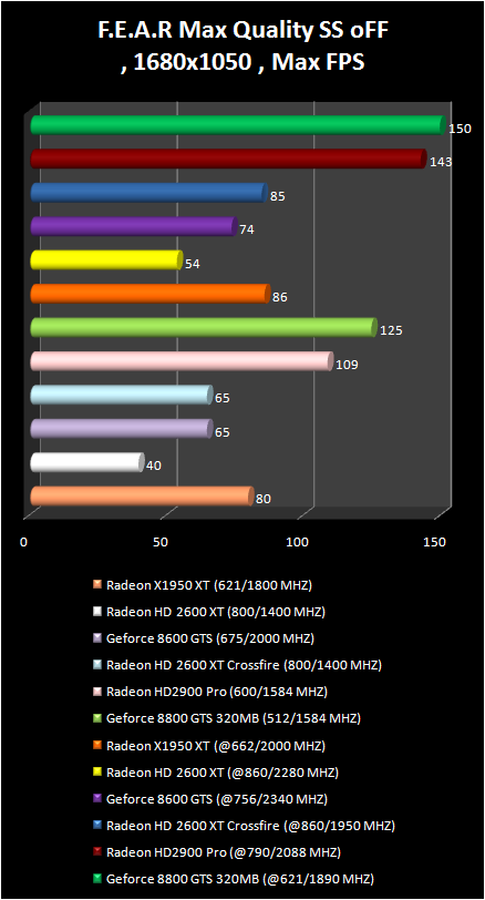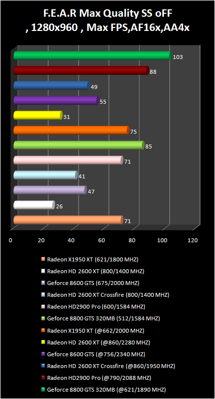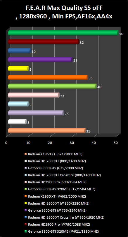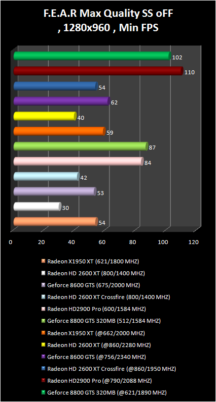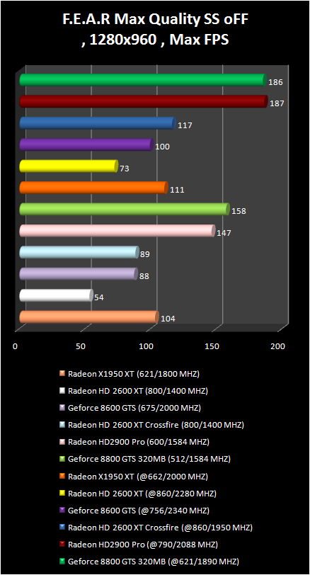 In F.E.A.R game the Radeon HD 2900 Pro just lags behind the GeForce 8800 GTS 320 mb. . Their results are completely equal with overclock in the resolution 1280 X 960. The pair Of radeon HD 2600 XT in CrossFire regime demonstrates an amazing performance increase in the comparison with single video card; Actually, only radeon HD 2900 Pro and GeForce 8800 GTS allow a comfortable game play in more qualitative regimes: