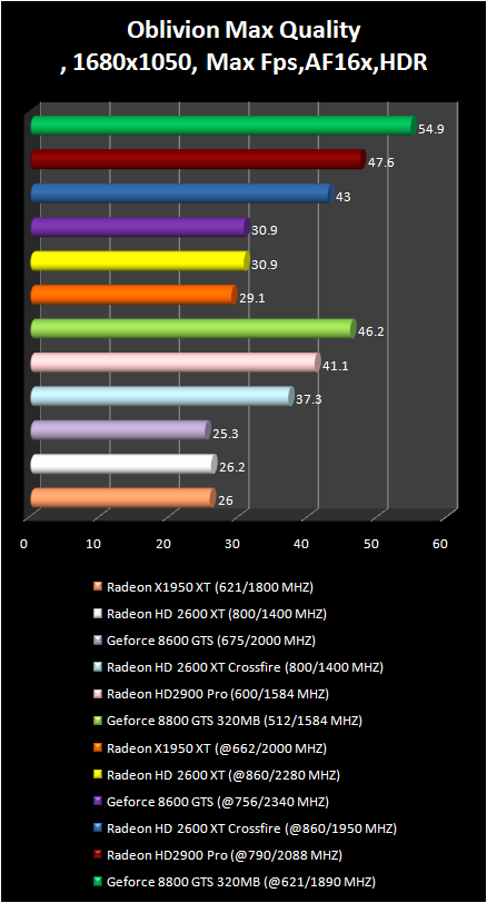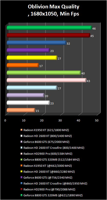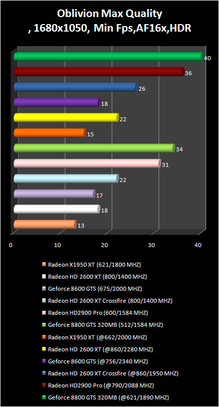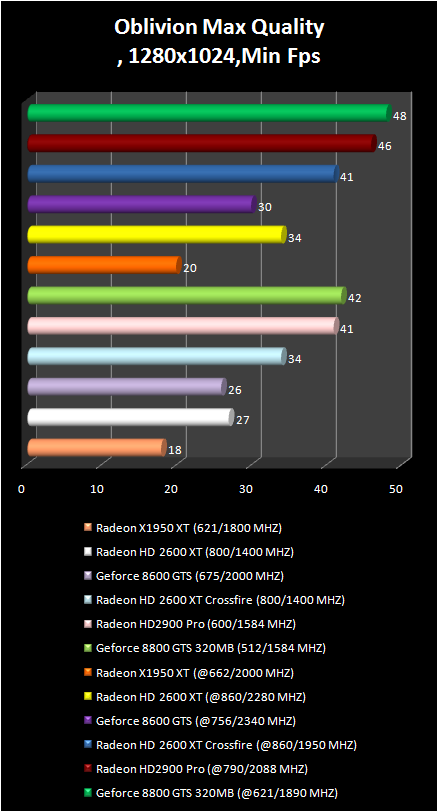 The Video card radeon were always strong in the elder scrolls IV: Oblivion game , and this was not exception for the new radeon card : The Radeon HD 2900 Pro in the resolution 1280 X 1024 is the leader, and in wide-screen 1680 X 1050 it is a bit slower than GeForce 8800 GTS 320 mb. CrossFire system made by two Radeon HD 2600 XT solidly was based in the second place. It is interesting that single 2600 XT successfully competes with more expensive GeForce 8600 GTS.