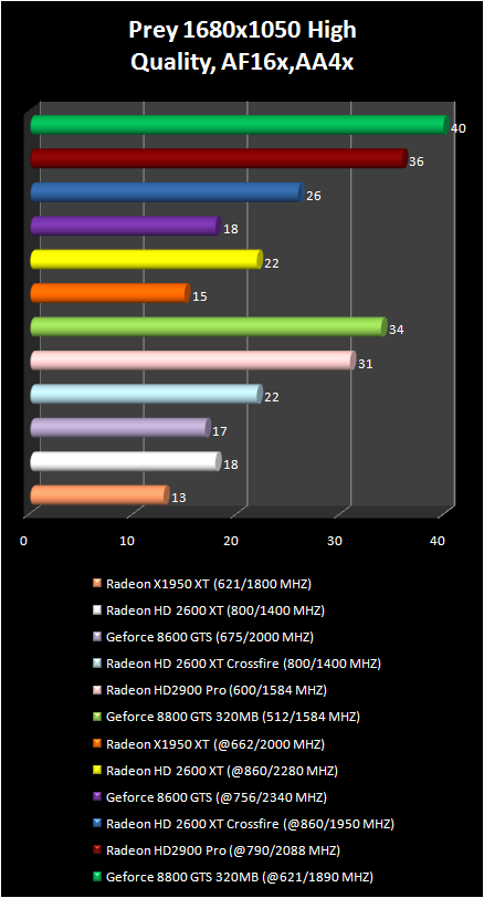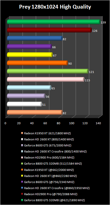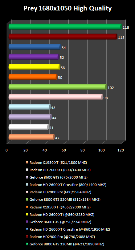 Prey test results did not introduce anything new. AMD radeon HD 2900 Pro noncritically lags behind NVIDIA geForce 8800 GTS 320 mb. We note the high productivity Of radeon x1950 XT in the resolution 1280 X 1024 and its very considerable drop upon transfer to the wide-format resolution 1680 X 1050. . It is obvious that all tested today video card satisfy the need of this game for the video memory only in the resolution 1280 X 1024.