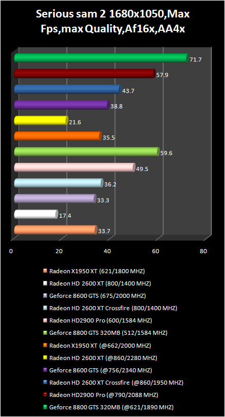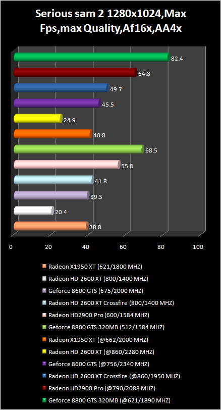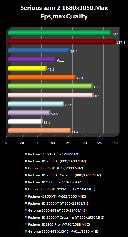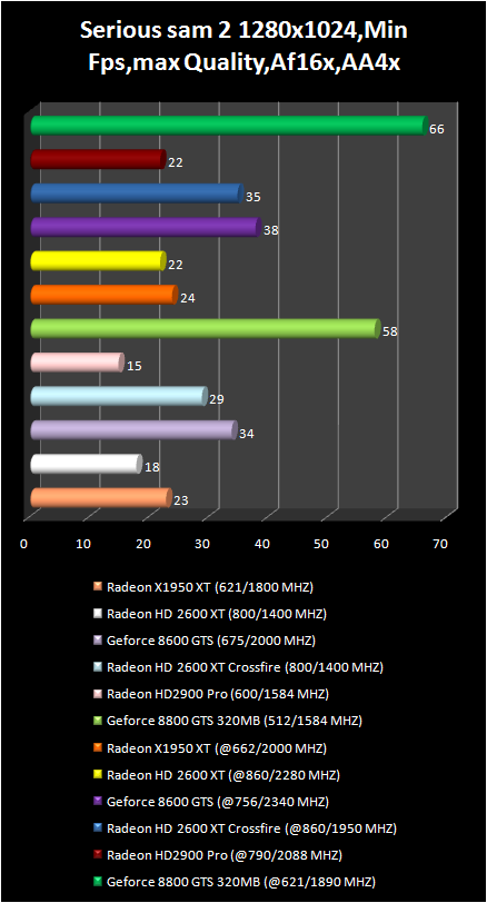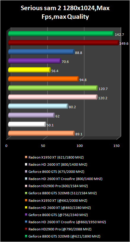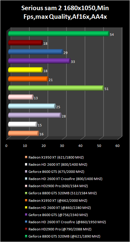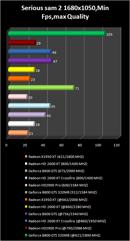 It is possible to play in Serious sam 2 With full screen smoothing, anisotropic filtration and HDR only using Radeon HD 2900 Pro and GeForce 8800 GTS . Moreover the first video card is inferior not only in average frame number , but also in its minimum value . Comfort in this game is only with GeForce 8800 GTS are better video card . However, due to the lower price of HD 2900 Pro the performance difference could be reexamined . As far as CrossFire system on base of two Radeon HD 2600 XT are concerned they can compete only with GeForce 8600 GTS.