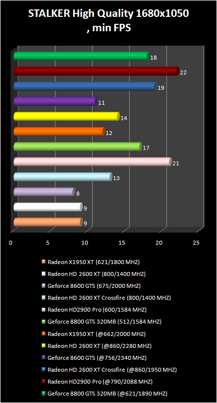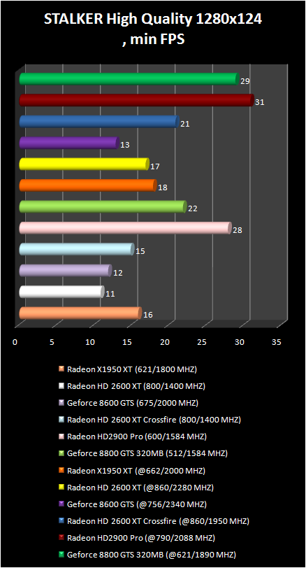 New video card Radeon HD 2900 Pro compete as the minimum with more expensive GeForce 8800 GTS 320 mb. Comparable on cost two Radeon HD 2600 XT are slower than Radeon HD 2900 Pro . Let us note that In CrossFire we have higher minimum frame -rate.