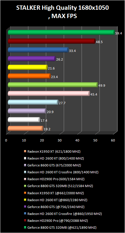 S.T.A.L.K.E.R. Game - Shadow Of chernobyl was tested with the complete dynamic illumination without full screen smoothing. As a result the performance of AMD radeon HD 2900 Pro is noticeably lower than NVIDIA geForce 8800 GTS 320 mb., which is logical, if we take in consideration the cost of such video card. The weakest in today\'s tests video card is the radeon HD 2600 XT. But here CrossFire allow the two video cards to outdistance the GeForce 8600 GTS.