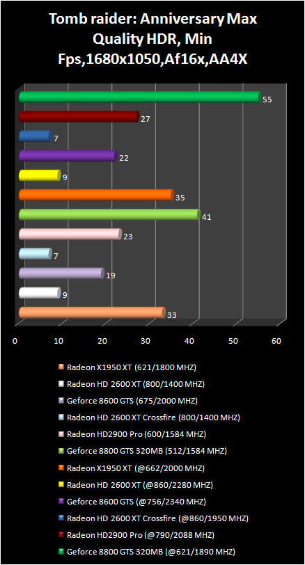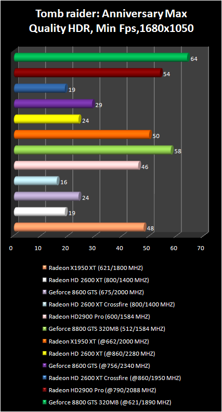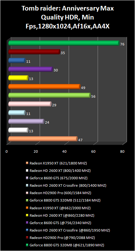 It is worthwhile to note the performance drop in Tomb raider: Anniversary with crossFire ( Radeon HD 2600 XT ). The Radeon x1950 XT solidly occupied the third place. Moreover with full screen smoothing and anisotropic filtration this video card is faster than the Radeon HD 2900 Pro !!!!!!!:
