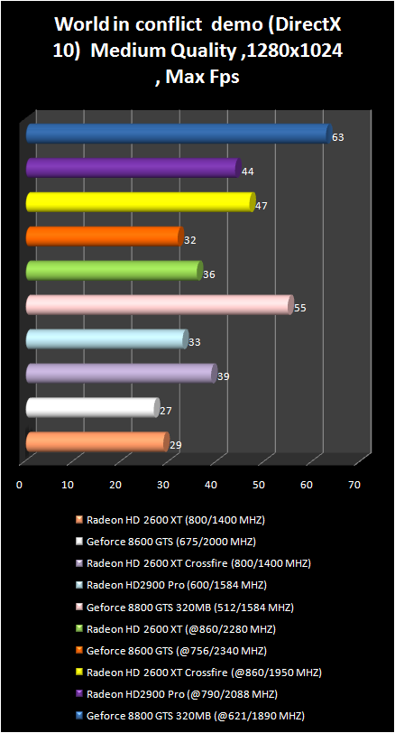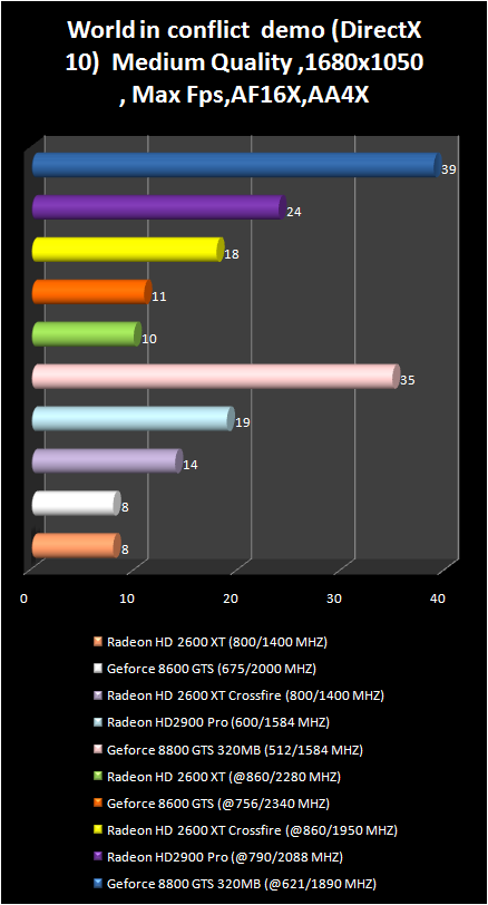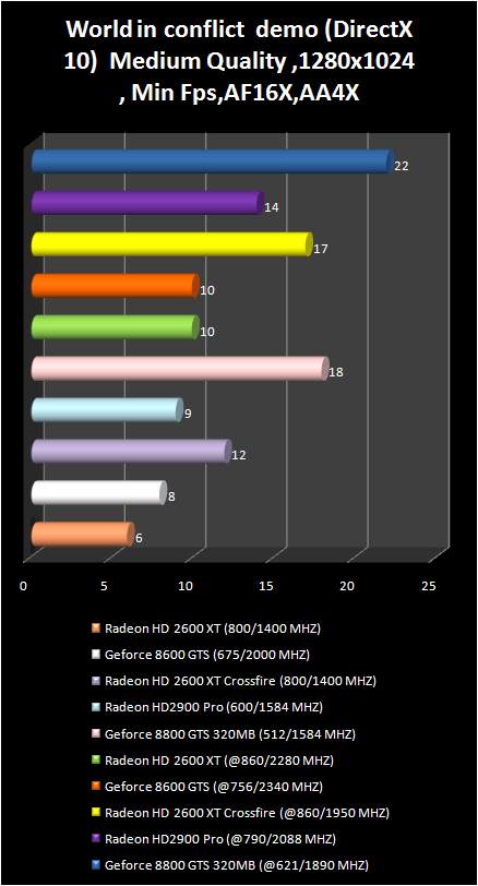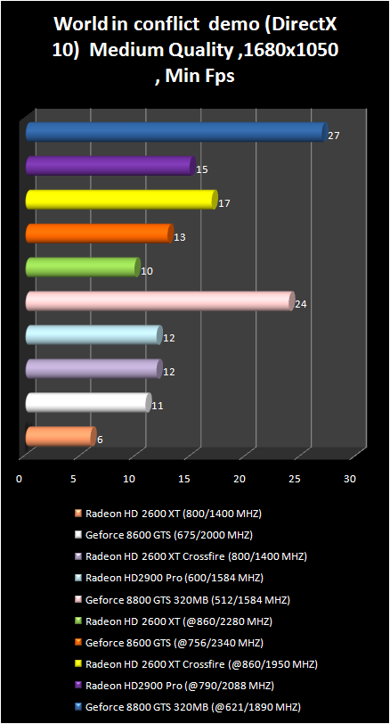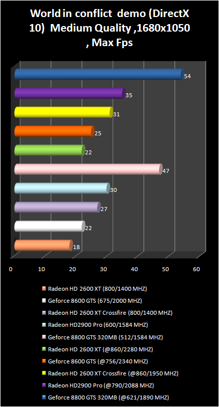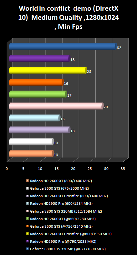 But here in the demo- version of new strategy real time world in conflict, which also uses DirectX 10, the GeForce 8800 GTS is just out of competition. Let us note the superiority Of crossFire radeon HD 2600 XT over Radeon HD 2900 Pro in the resolution 1280 X 1024.