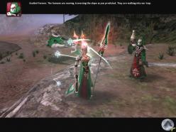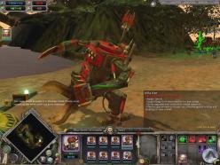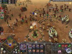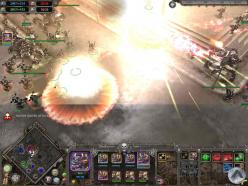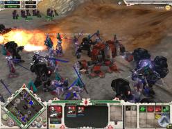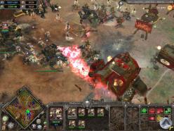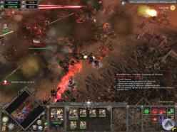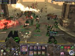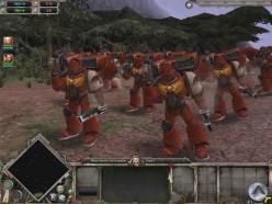 Interestingly, there are no single units when it comes to infantry. All summoned troops come in squads, and can be reinforced up to a certain racial cap. For example, a squad of Space Marines comes in by default at four, and can be reinforced to a maximum of 10 (eight plus a sergeant and an attached special unit) after you’ve researched up the limit for the Marines. This is in contrast to the Orks limit of 17 units per squad. You can also research sergeant ranks, one per squad to increase morale. They have access to higher grade weapons like power-fists and chain swords that normal units don’t get, improving squad efficiency. Unique commander troops can also be summoned. These have access to the best weapons, enforce morale even more than sergeants, and usually have special abilities like Daemon Strength (for Chaos). Finally there are the special heavy units - walkers, tanks, and such. The armies of the Emperor have the widest variety of vehicles, as well as the most powerful. This is offset by certain massive creatures that the other races have access to. The Orks have the Squiggoth (a giant armored dinosaur), Chaos has the Bloodthirster Greater Daemon, and the Eldar have the Avatar of Khaine, their blood-handed god of war. All of these are rare on the battlefield, but deal frightening amounts of damage when called.