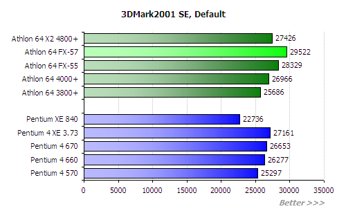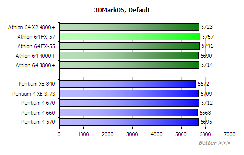 The results of the newer 3DMark05 benchmark are greatly limited by the performance of the graphics subsystem. Anyway, the platform with the new AMD processor turns in the best result.