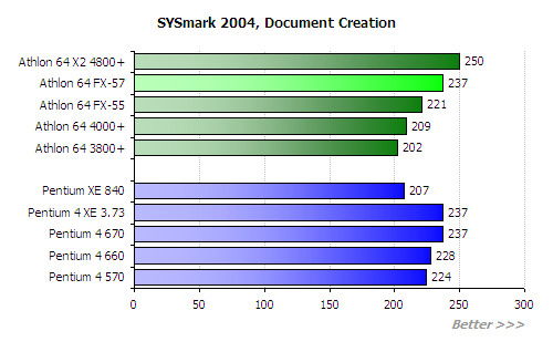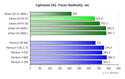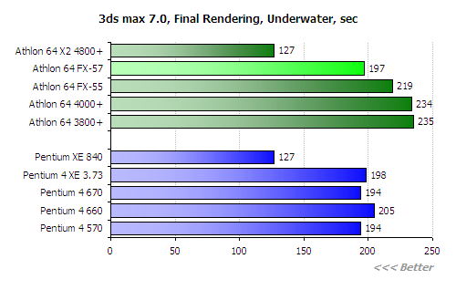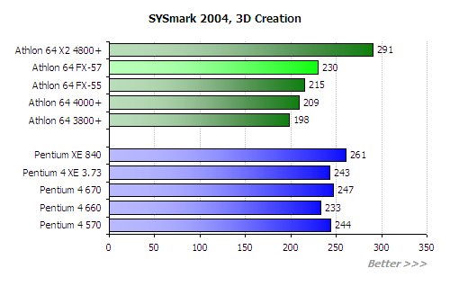If there were no dual-core architectures, the Athlon 64 FX-57 would be the best processor for 3D rendering. But such tasks can be easily paralleled, so the use of single-core architectures is now inefficient for them