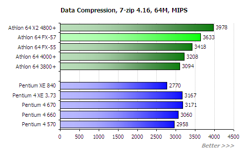 AMD’s new product is fast in data compression programs. It is first in WinRAR and second, after the dual-core Athlon 64 X2 4800+, in 7zip which supports multi-threading.