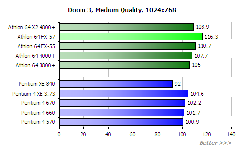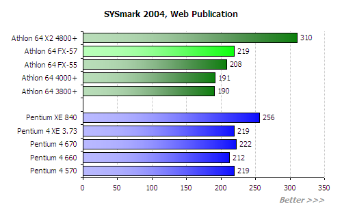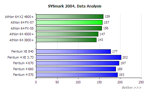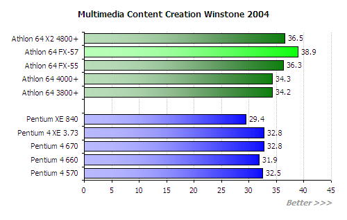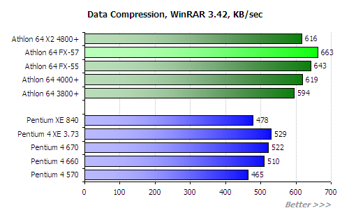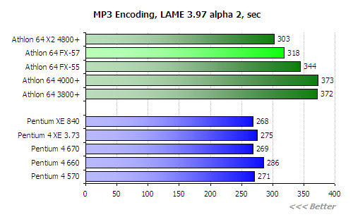 Pentium 4 processors are better optimized for processing streaming media data, though. The Athlon 64 FX-57 with its 2.8GHz frequency and support of SSE3 instructions is anyway slower than the senior Pentium 4 models with such codecs as Lame, Mainconcept, and DivX.