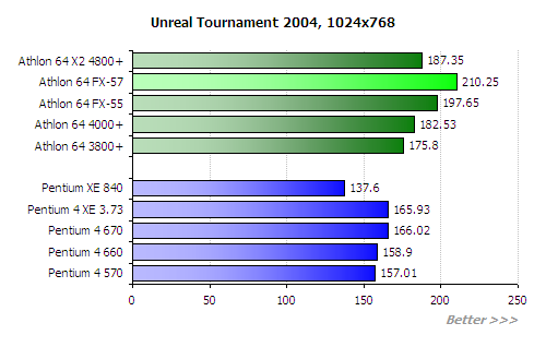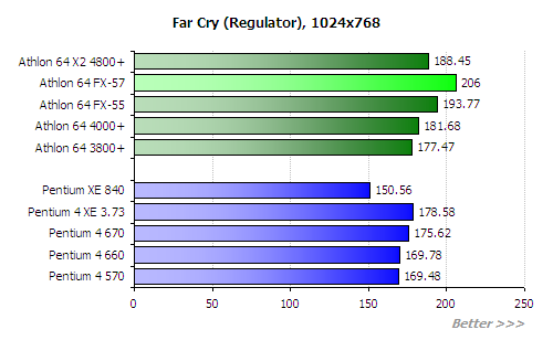 in fact had long given up competing with AMD in this market sector. Having reached 3.8GHz frequency, Pentium 4 series processors went another way of development: this series has only been adding new features and increasing the L2 cache size in the last year and a half. Due to this reason as well as some architectural peculiarities, modern processors of the NetBurst architecture have long been unable to challenge the performance of the Athlon 64 in games.