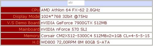 FX-62 to squeeze out the maximum performance, so some of the platforms used in testing the latest version of the nForce 500 series chip group, which is used by the nForce 570 SLI version, although not the most high-grade nForce Ultra 590, But I believe in performance, performance should also be quite good results only, and has been supported by DDR 2 Memory Framework, the choice here is a particularly excellent performance of the Extreme Performance Memory Corsair launched version -CM2X512-5300C4 This matched modules for a total capacity of 1GB=512MBx2 double access CL=4-5-5-15; Furthermore, display card is the use of the latest GeForce 7900GTX 512MB, driven version of the procedure to 84.56, and other detailed information please refer to the table below platform.